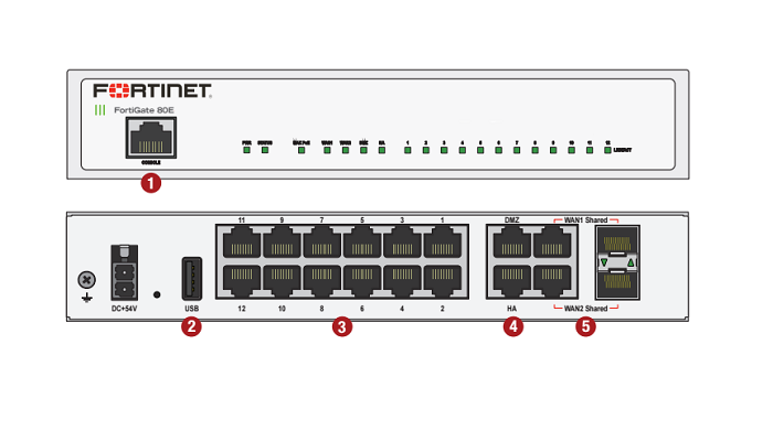 14 x GE RJ45 ports (including 1 x DMZ port, 1 x Mgmt port, 1 x HA port, 12 x switch ports), 2 x Shared Media pairs (Including 2 x GE RJ45 ports, 2 x SFP slots). 128GB onboard storage.